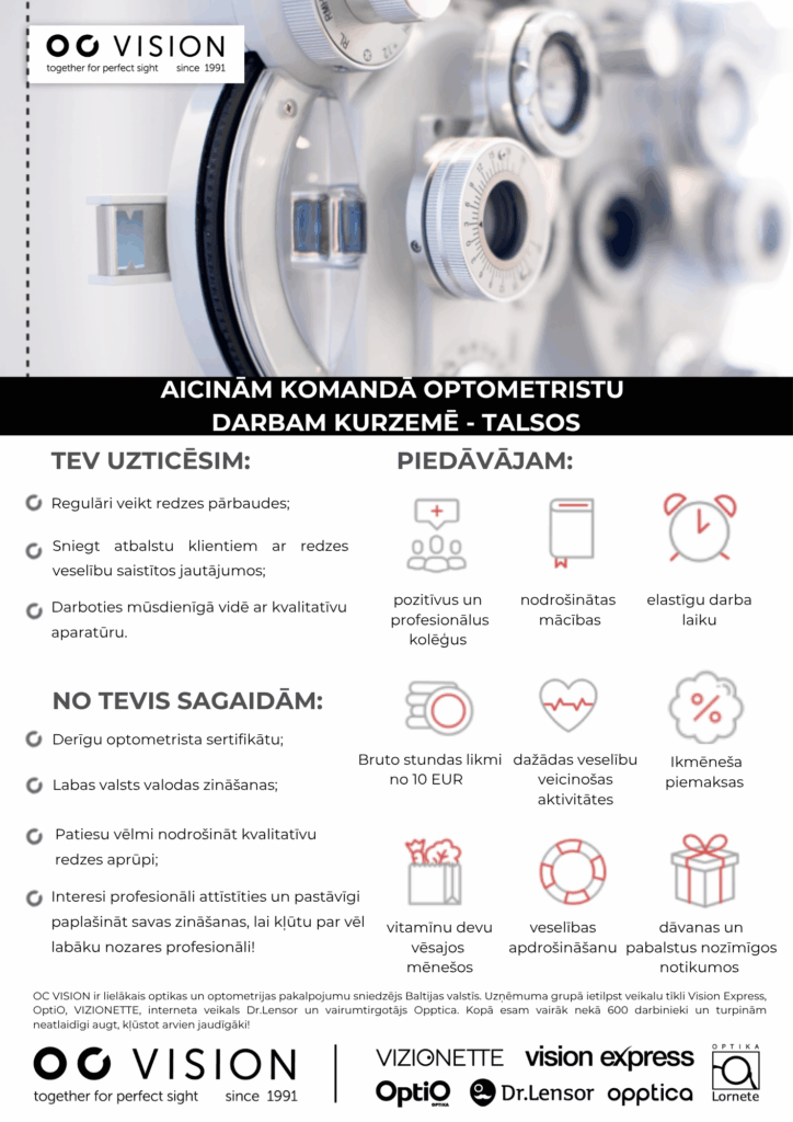 Te ir darbs optometristam Posted on 09.10.25 by LOOA SIA OC VISION aicina komandā optometristu darbam Talsos. Interesenti ir aicināti aizpildīt pieteikšanās formu šeit vai sūtīt CV uz hr@ocvision.eu.