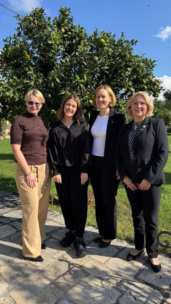 Attēlā pa kreisi – LOOA prezidente Aiga Švede, attēlā pa labi visu 3 Baltijas valstu optometrijas un optikas nozaru asociāciju pārstāves ECOO ģenerālajā asamblejā Apūlijā, Itālijā 2025. gada 19. oktobrī (no kreisās: Rasa Palevičiene (Lietuva), Katriine Mark (Igaunija), Aiga Švede (Latvija), Vaida Kačergiene (Lietuva)).