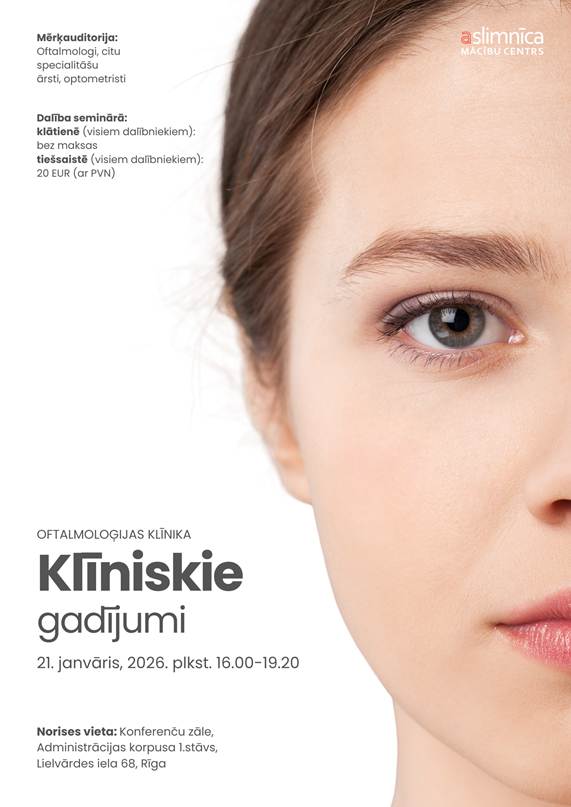 “Aslimnīcas Mācību centrs” aicina reģistrēties Austrumu slimnīcas Oftalmoloģijas klīnikas semināram “Klīniskie gadījumi” kas norisināsies 2026. gada 21. janvārī plkst. 16.00-19.20 Stacionāra “Biķernieki” konferenču zālē un Zoom platformā.