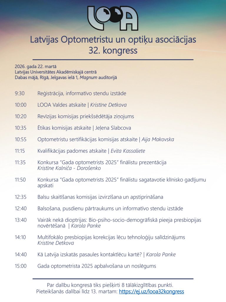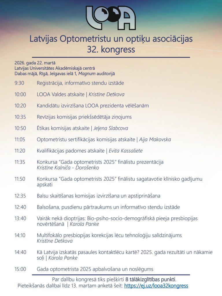 Kongresa programma ietver LOOA komisiju ziņojumus par to, kā mums ir gājis pagājušajā gadā, konkursa “Gada optometrists 2025” finālistu klīnisko gadījumu prezentācijas. Programmas klīniski zinātniskajā daļā paredzētas lekcijas par presbiopijas novērtēšanu, multifokālo korekcijas lēcu tehnoloģijām un kontaktlēcu prakses attīstības tendencēm pasaulē un Latvijā. Pasākuma noslēgumā pēc noslēdzošā balsojuma notiks konkursa “Gada optometrists 2025” laureāta apbalvošana.