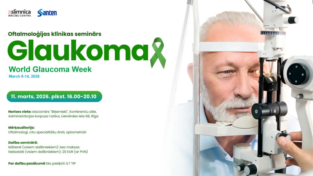“Aslimnīcas Mācību centrs” aicina reģistrēties Austrumu slimnīcas Oftalmoloģijas klīnikas semināram “World Glaucoma Week 2026” kas norisināsies 2026. gada 11. martā plkst. 16.00-20.10 Stacionāra “Biķernieki” konferenču zālē un Zoom platformā.