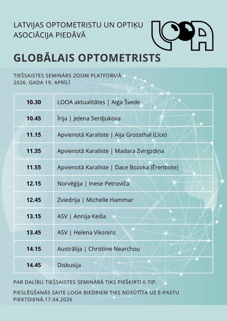 Aicinām visus LOOA biedrus piedalīties tiešsaistes seminārā “Globālais optometrists”, kas norisināsies svētdien, 2026. gada 19. aprīlī no plkst. 10.30 līdz 15.00 Zoom platformā.